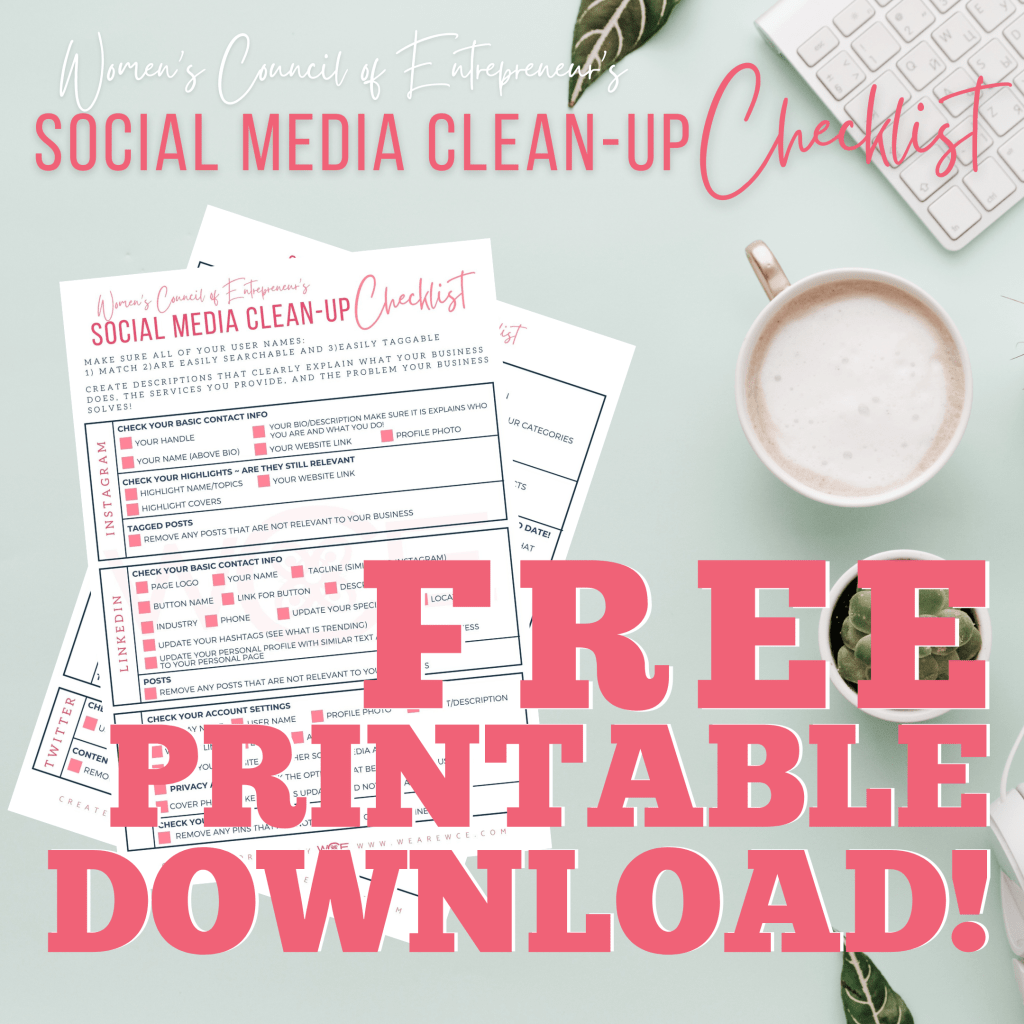 You’re ready to start cleaning up your social media platforms with WCE’s Social Media Clean-Up Checklist Worksheet! Click HERE or click the picture for the FREE download!