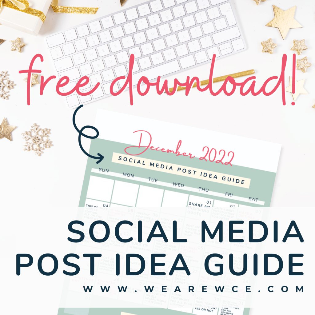 Now, as we have stated in the other monthly post guides ~ you can use our Monthly Social Media Post Idea Guide by following day by day, you can pick or choose which posts work best for you and your business, or you can use these tips simply as a guide and come up with your own posts! Whichever way you use it, we want you to always BE YOU and show your value! We found it’s best with any of our ideas to put your own twist on it that can really showcase you and your business. Use your platform and posts to present to your audience your value and the value of your product and/or service.With all that said you can download for FREE WCE’s December Social Media Post Idea Guide by clicking the button or the photo below!