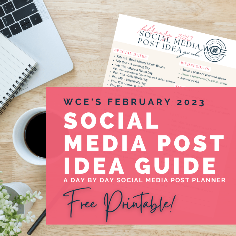The Women’s Council of Entrepreneurs is dedicated to helping business owners thrive. To support that goal, we offer a monthly social media guide with content ideas for each day of the month. This guide is designed to help ease the burden of social media management. We know how tough it can be to come up with ideas and create content, so we hope this guide will help relieve some of that stress – And we are pleased to announce the February edition is now available!